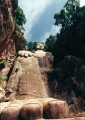 沿大佛左侧的棱云栈道可直接到达大佛的底部。在此抬头仰望大佛,会有仰之弥高的感觉。坐像右侧有一条九曲古栈道。栈道沿著佛像的右侧绝壁开凿而成,奇陡无比,曲折九转,方能登上栈道的顶端。这里是大佛头部的右侧,也就是凌云山的山顶。此处可观赏到大佛头部的雕刻艺术。大佛顶上的头发,共有螺髻1021个。远看发髻与头部浑然一体,实则以石块逐个嵌就。